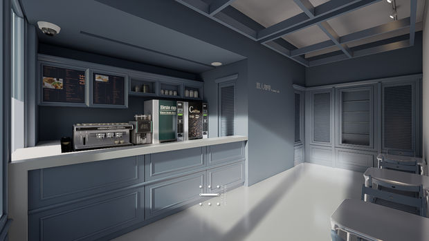 外賣窗口設置於入門左側,對內結合吧台;大面積的靛藍色自門面、吧台延伸至對門牆,以美式風格為基底;透過單一色系引導視覺入內,強調個性氛圍、提升品牌辨識度。